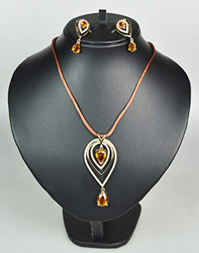 CHARTAGE NECKLACE SET WITH BELGIAN DESIGN. Rhodium Plated Metal with Aquamarine Stone/ Cubic Zircon (ST59624) BROWN CORD+TOPAZ STONE
